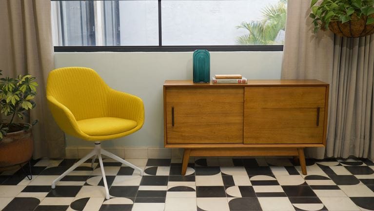 En este espacio, se eligió un tapizado amarillo vibrante, aportando energía y dinamismo a la sala, favoreciendo un entorno creativo e inspirador.